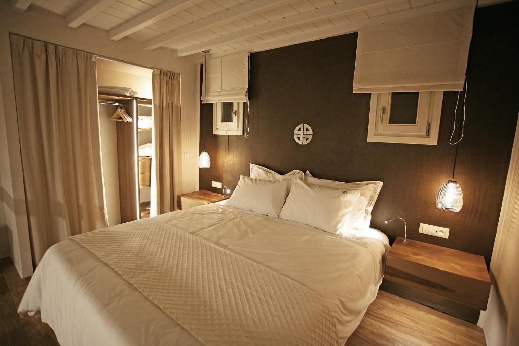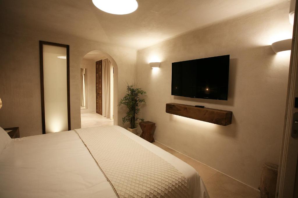 Sobe: Sobe i apartmani su prostrani, moderni i nazvani po bogovima i nimfama iz grčke mitologije. Opremljeni su klimom, flat-screen TV-om sa satelitskim kanalima, sefom, aparatom za kafu/čaj, frižiderom (neki imaju i kuhinju), kupatilom sa tušem, bade-mantilima i besplatnim toaletnim priborom. Većina ima balkon ili terasu sa pogledom na more, bazen ili vrt – neki čak i privatni jacuzzi. Dekoracija kombinuje kikladski stil sa toplim drvetom i kamenom, pružajući eleganciju i komfor.